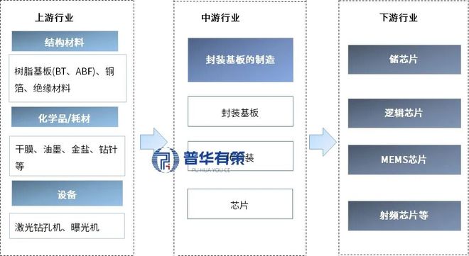 IC封装基板产业链上游主要包括树脂、铜箔、绝缘材料bifa必发娱乐、干膜、油墨、金盐、钻头等关键原材料,以及激光钻孔机bifa必发娱乐、曝光机等核心生产设备,材料与设备的技术水平直接决定了基板的电气性能、热管理能力和可靠性。中游环节为封装基板的加工制造,是产业链的核心部分bifa必发娱乐,涉及精密图形制作、微孔钻刻、表面处理等复杂工艺流程,具有技术壁垒高、资本投入大等特点。下游主要应用于存储芯片、逻辑芯片、MEMS芯片、射频芯片等各类芯片的封装,并最终广泛应用于消费电子、通信设备、汽车电子、工业控制及航空航天等终端电子产品。
