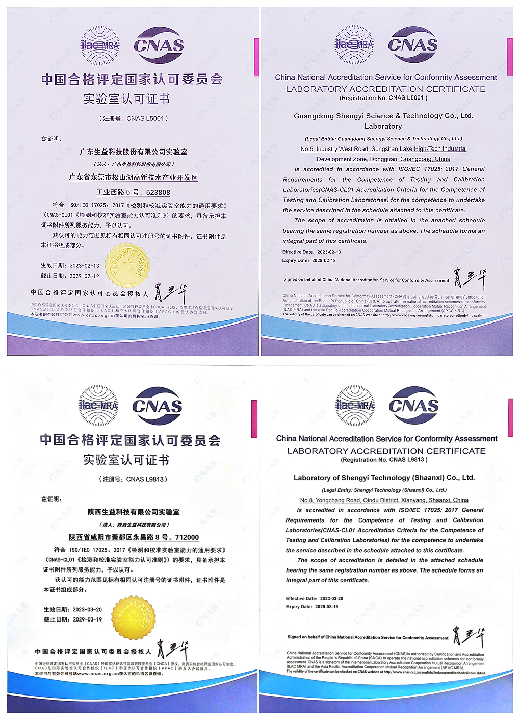 陕西BFindex必发指数网实验室于2017年3月取得CNAS实验室资格。(右图为CNAS2023年3月-2029年3月实验室认可证书)